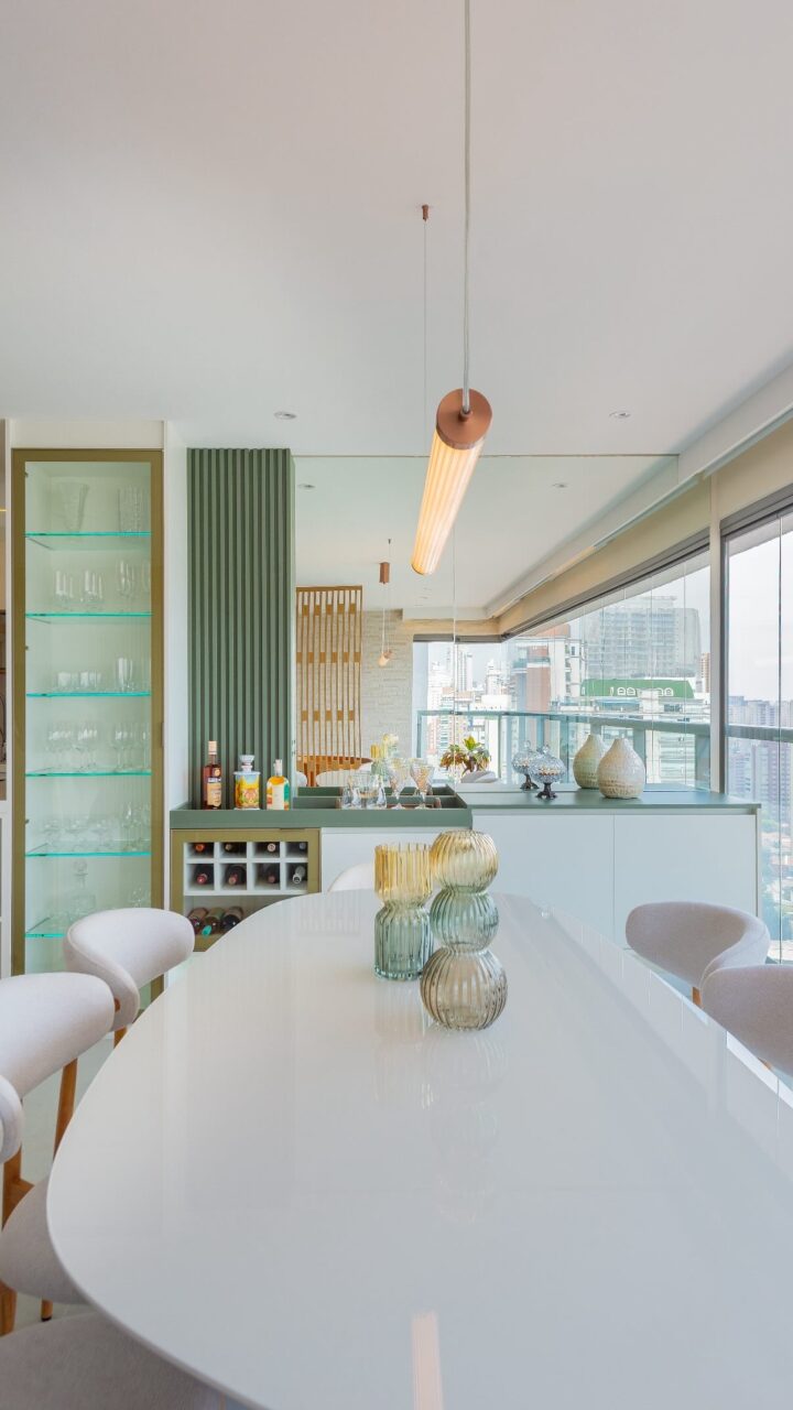 Na cozinha, o charme fica por conta do vidro Reflecta Bronze, que reflete a luz com sutileza e adiciona um ar contemporâneo ao espaço. A cristaleira com vidro incolor complementa o ambiente com transparência e sofisticação, valorizando cada peça exposta e integrando-se harmoniosamente ao restante do projeto.